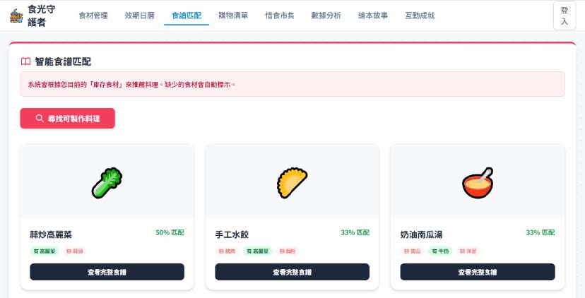 智能食譜匹配 為了讓剩餘食材發揮最大價值並解決使用者「不知如何料理」的困 擾,本組特別研發「智能食譜匹配」功能。系統會自動讀取資料庫中現 有的食材數據,即時比對並推薦最適合的料理方案,同時直觀地標示出 食材匹配百分比、現有食材及缺失食材。此功能不僅有效降低了食材因 閒置過期而造成的浪費,更讓下廚變得輕鬆有趣,成功將智能科技與環 保惜食理念深度整合於使用者的日常飲食生活中。