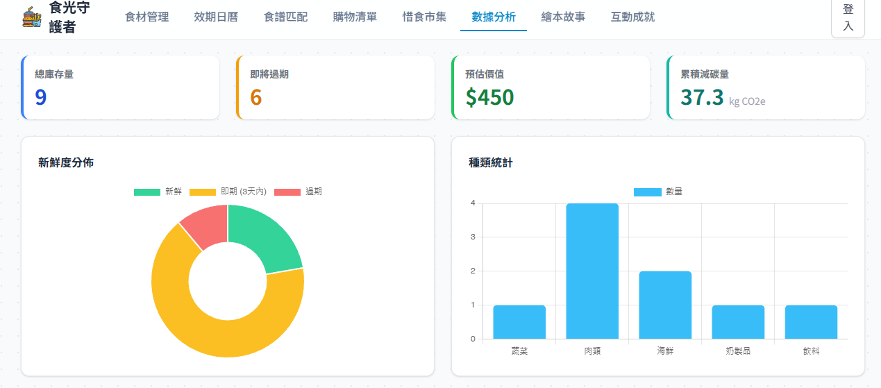 為了響應智能生活與永續發展,本組整合物聯網技術,打造自動化的食材管理流程,有效降低食物因保存不當或遺忘而造成的浪費,同時提升家庭飲食的使用效率。透過「數據分析」功能,系統能將繁雜的庫存資訊視覺化,即時呈現總庫存量、即將過期數量、預估價值及累積減碳量等關鍵指標。此外,藉由新鮮度分佈圓餅圖與食材種類統計圖,使用者能以更輕鬆的方式進行食材規劃與補貨管理,實現現代化、永續化的家庭食物管理模式。