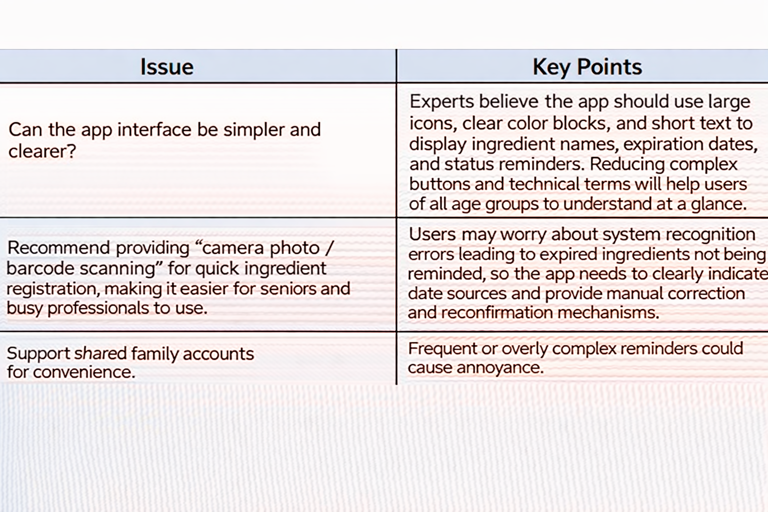 On November 5, 2025, our team interviewed a professor specializing in the Internet of Things (IoT). The discussion focused on practical challenges in daily ingredient management, differences in user needs across age groups when using digital management tools, priorities in system functionality and interface design, and strategies to enhance user acceptance and long-term engagement with smart ingredient management systems. The interview findings have been compiled in the appendix and serve as an important reference for subsequent system optimization and the development of our research conclusions.
